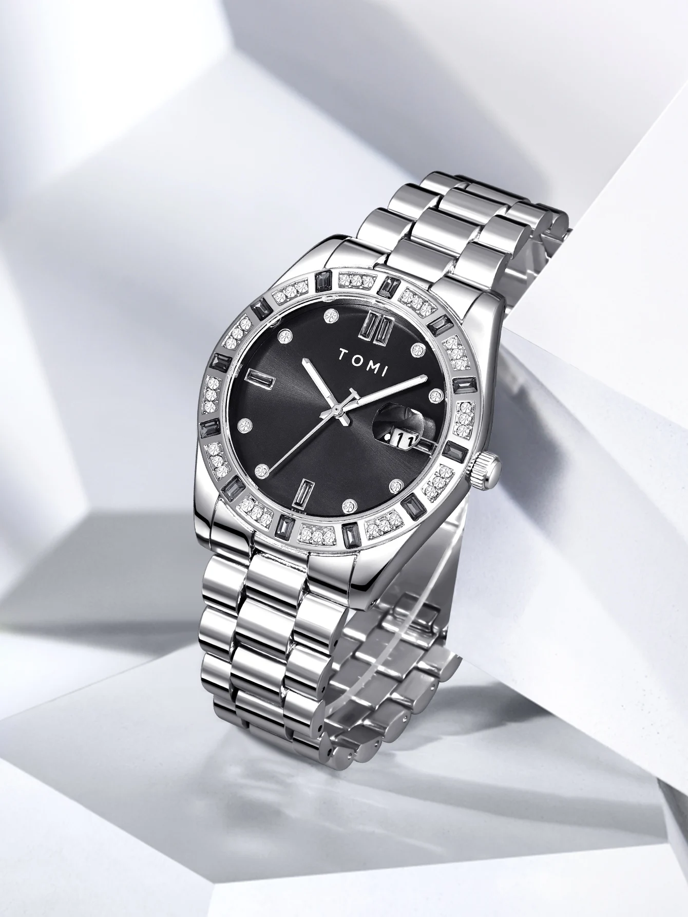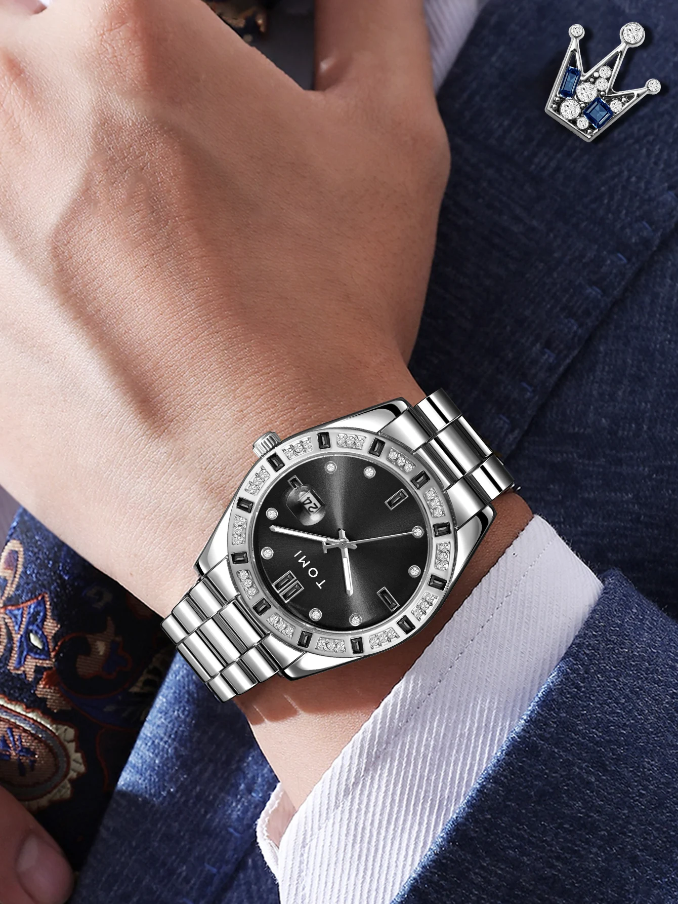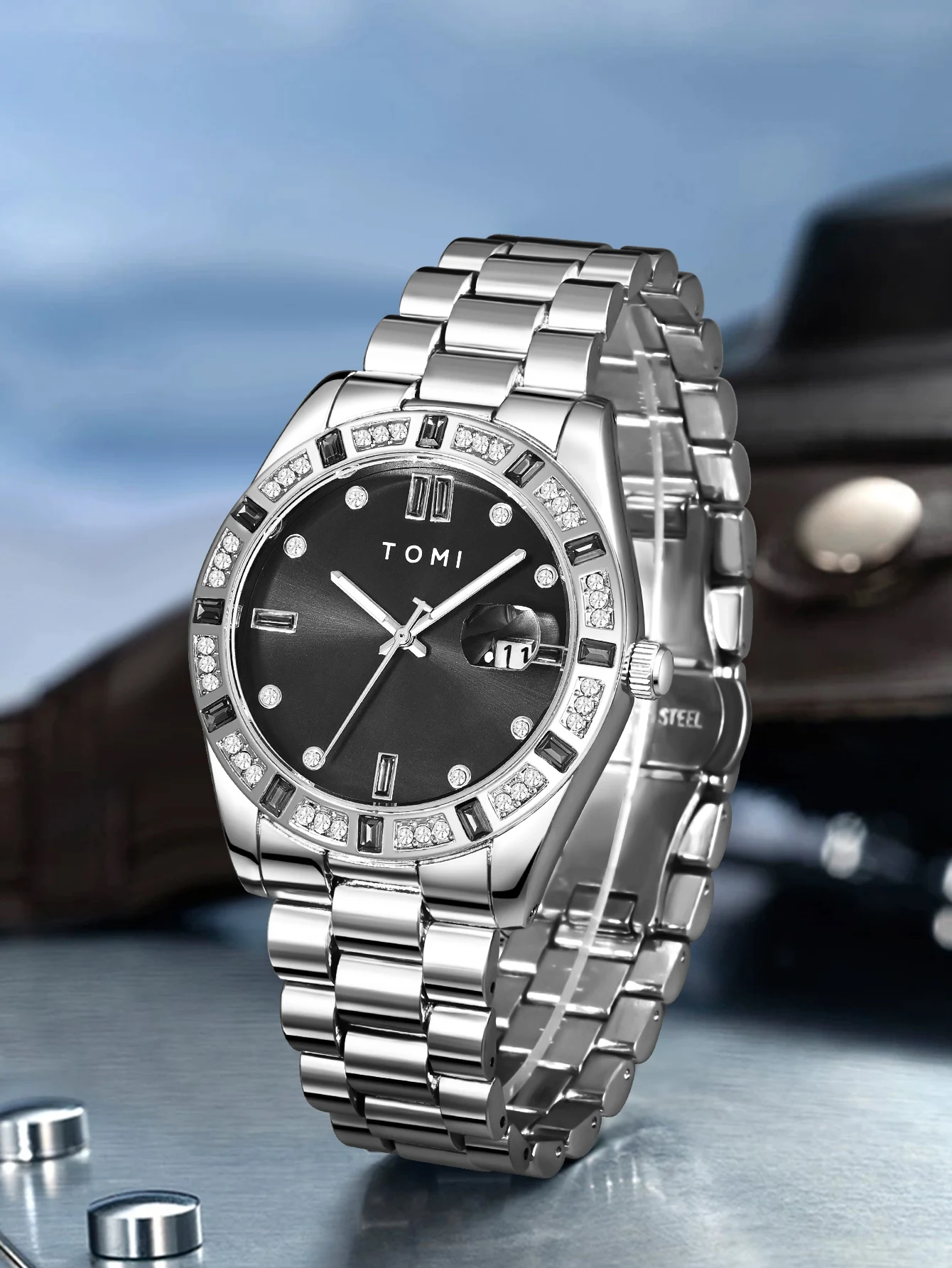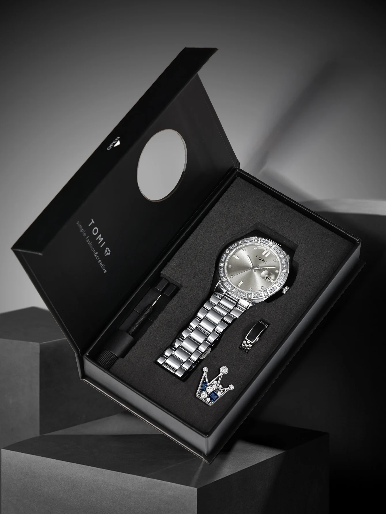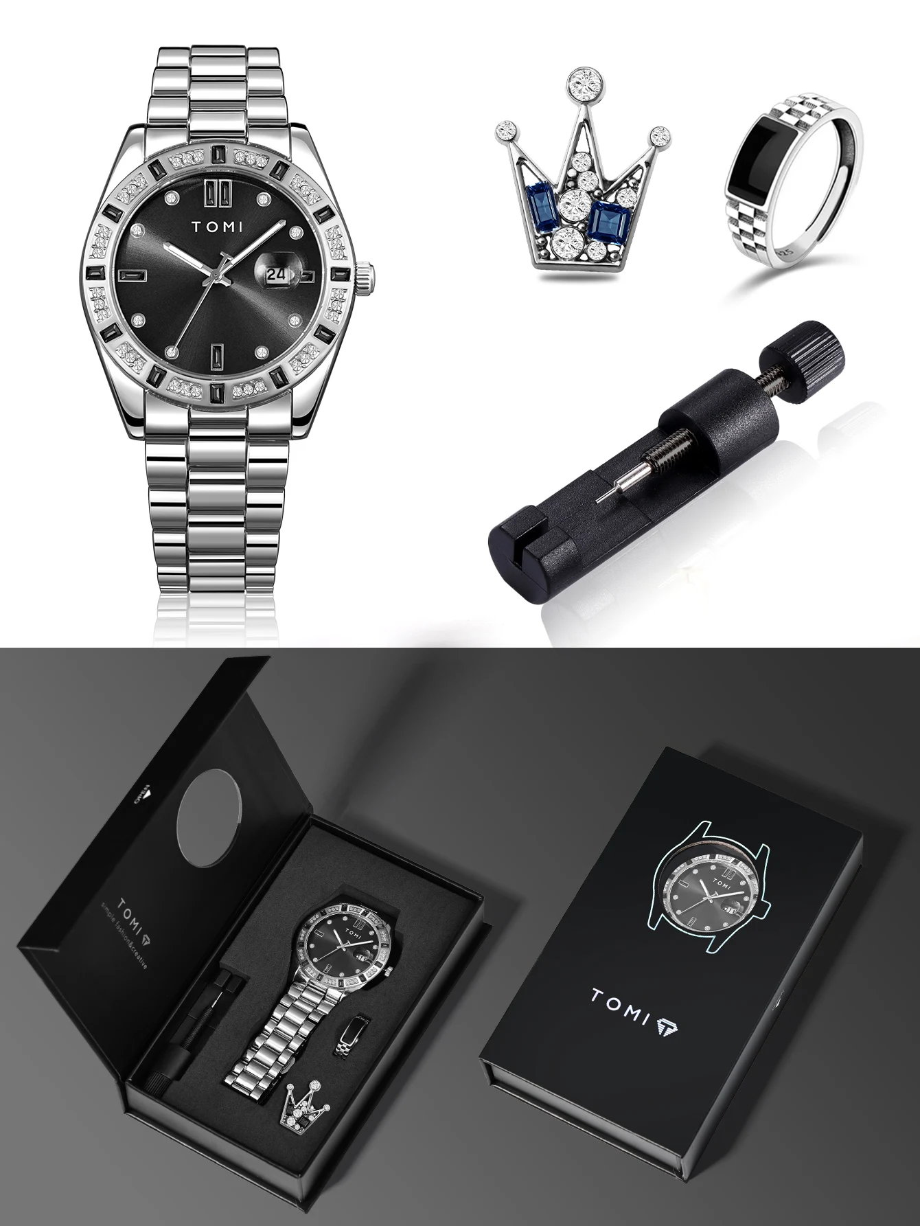 TOMI 4PCS Luxury Business Men's Watch Gift Box Set Luxury Diamond Case Calendar Stainless Steel Strap Quartz Watch Men's Clock