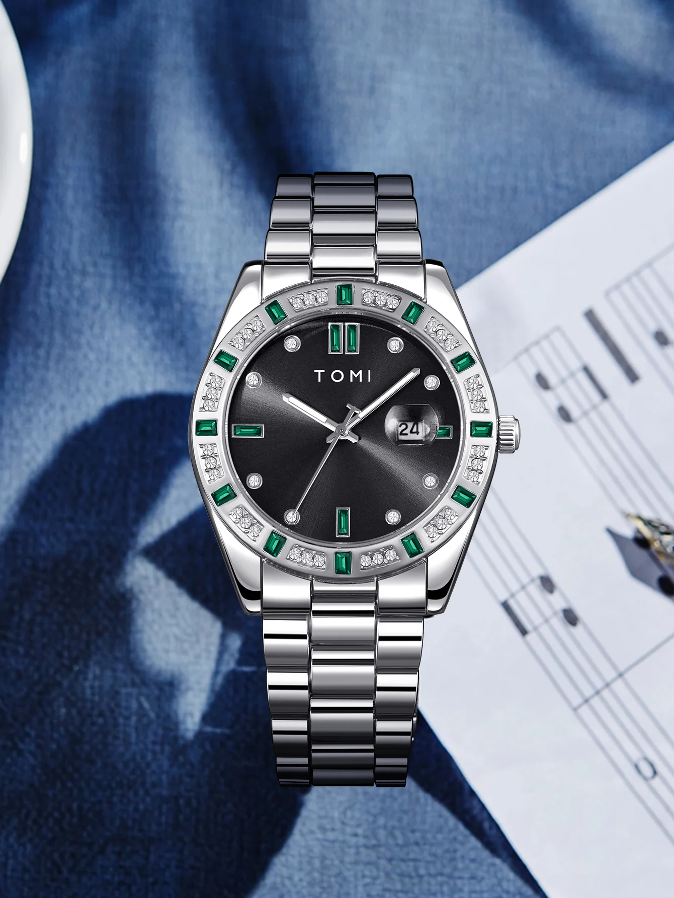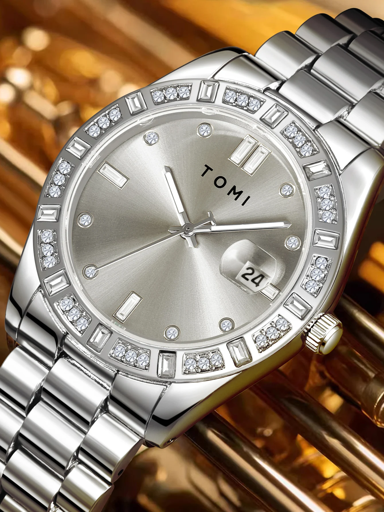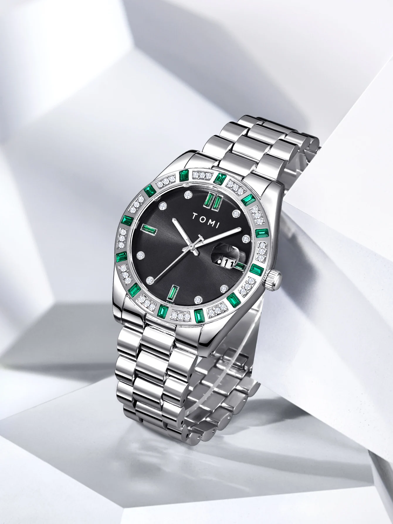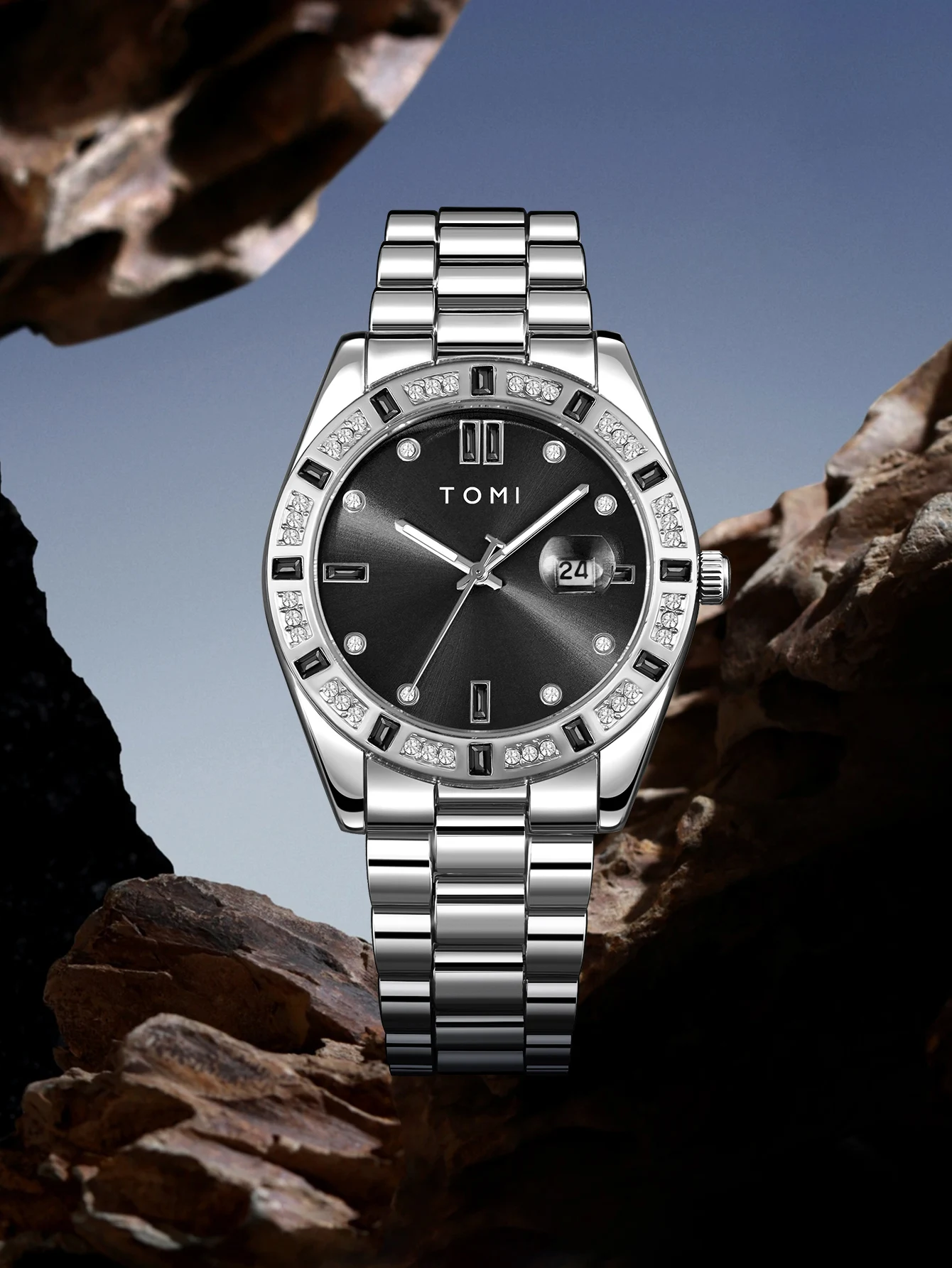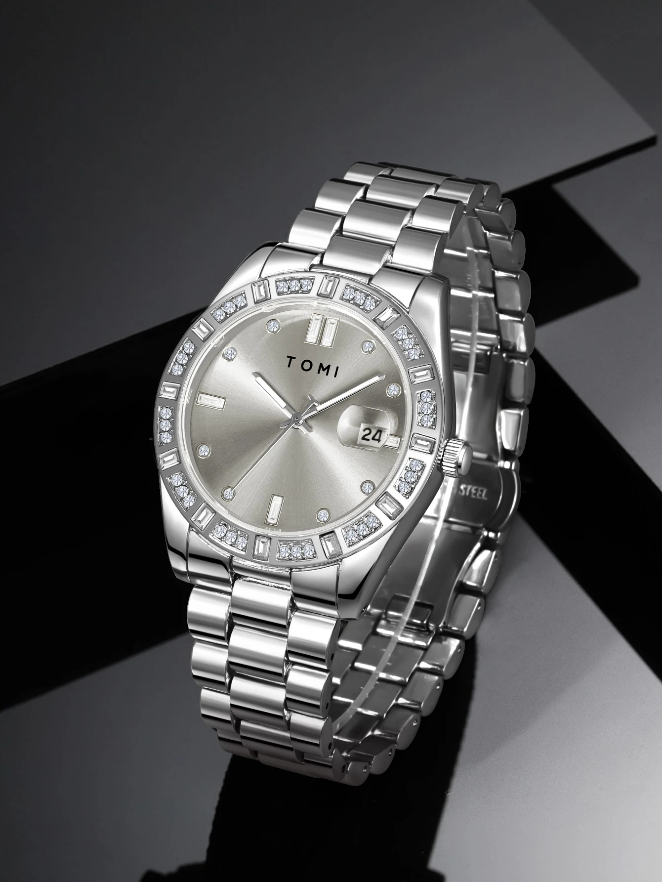 TOMI 4PCS Luxury Business Men's Watch Gift Box Set Luxury Diamond Case Calendar Stainless Steel Strap Quartz Watch Men's Clock